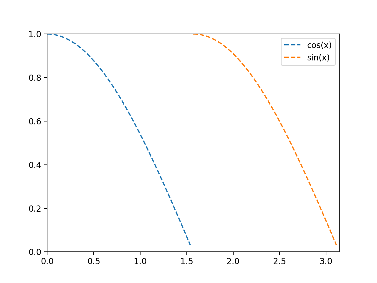# plt.plot(x0,np.cos(x0), '--',x1,np.sin(x1), '--')